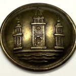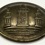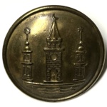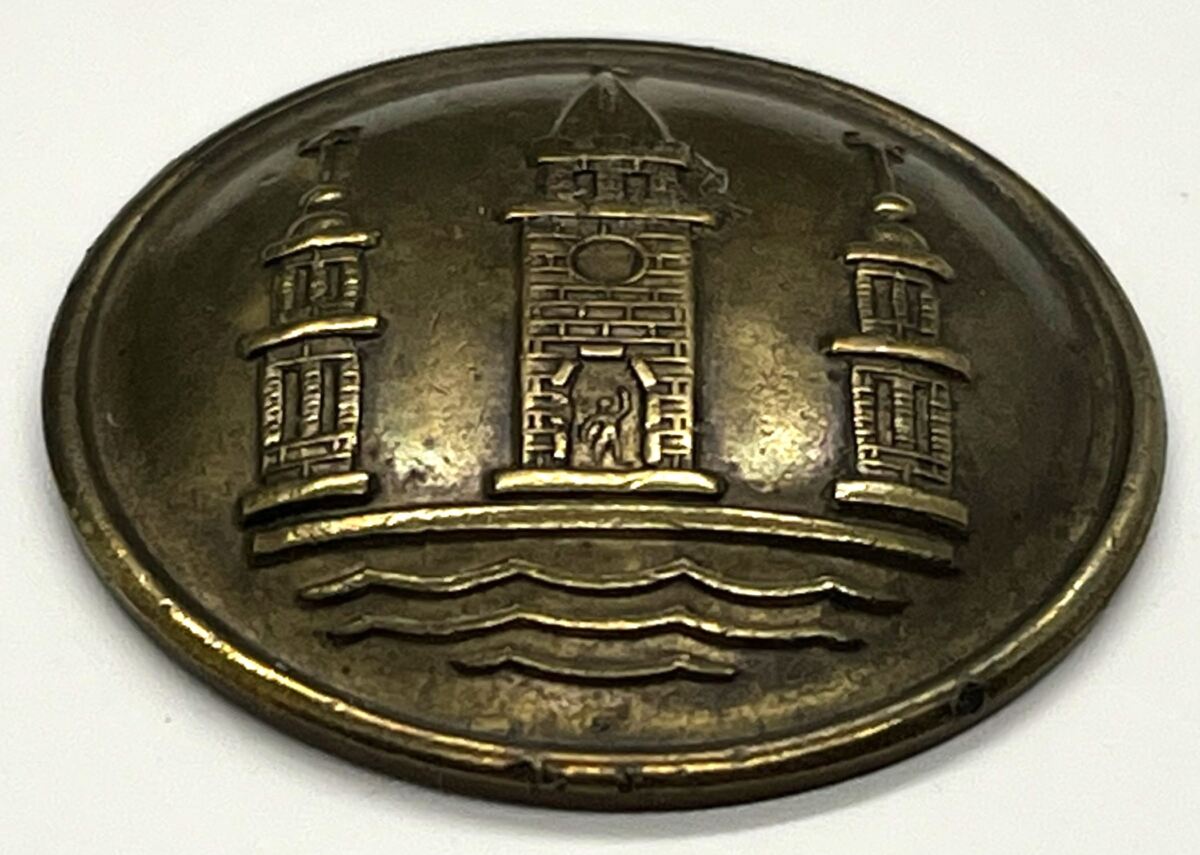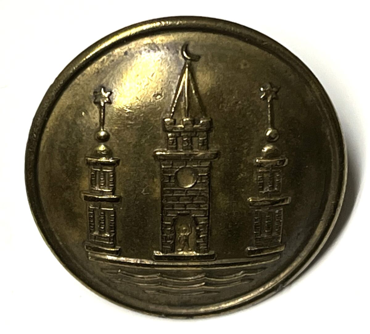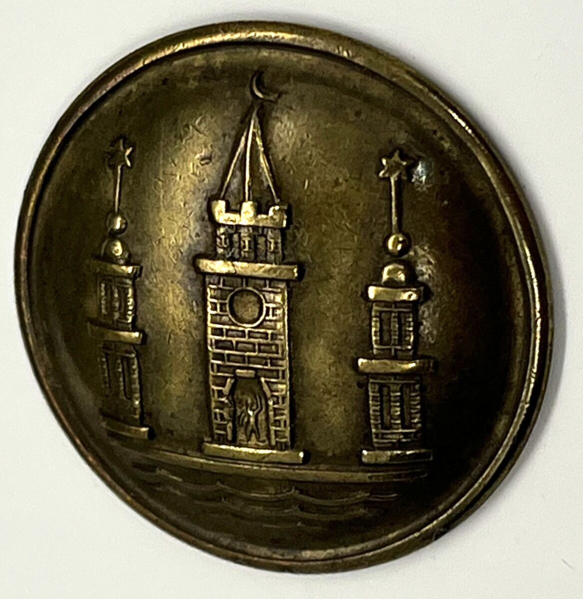 This button has a crisp relief of the Copenhagen city arms: three brick towers rising above stylized waves, with a crescent atop the central tower and stars atop the two side towers, representing the coat of arms of Copehnagen, Denmark.