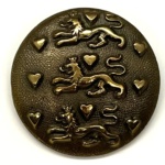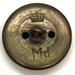 The button features the Lesser (state) version of the coat of arms of Denmark with three crowned lions and nine hearts, without the extra “full dress” elements you might see on the greater royal arms (such as supporters, a mantle, or a more complex shield). Backmark of crown over Md.