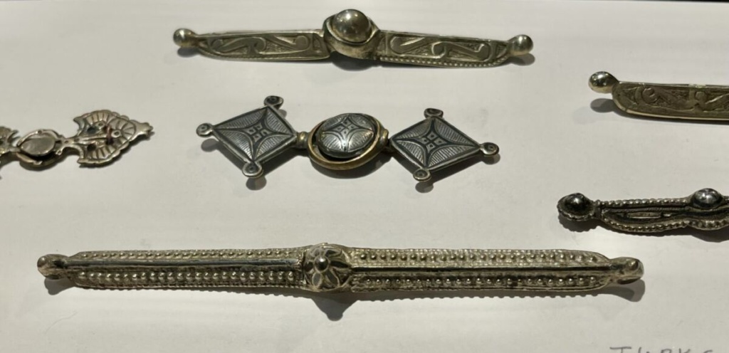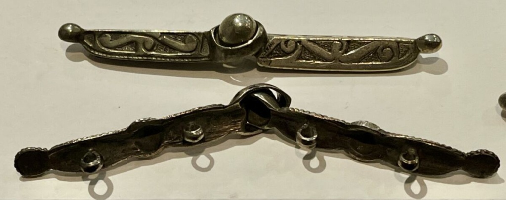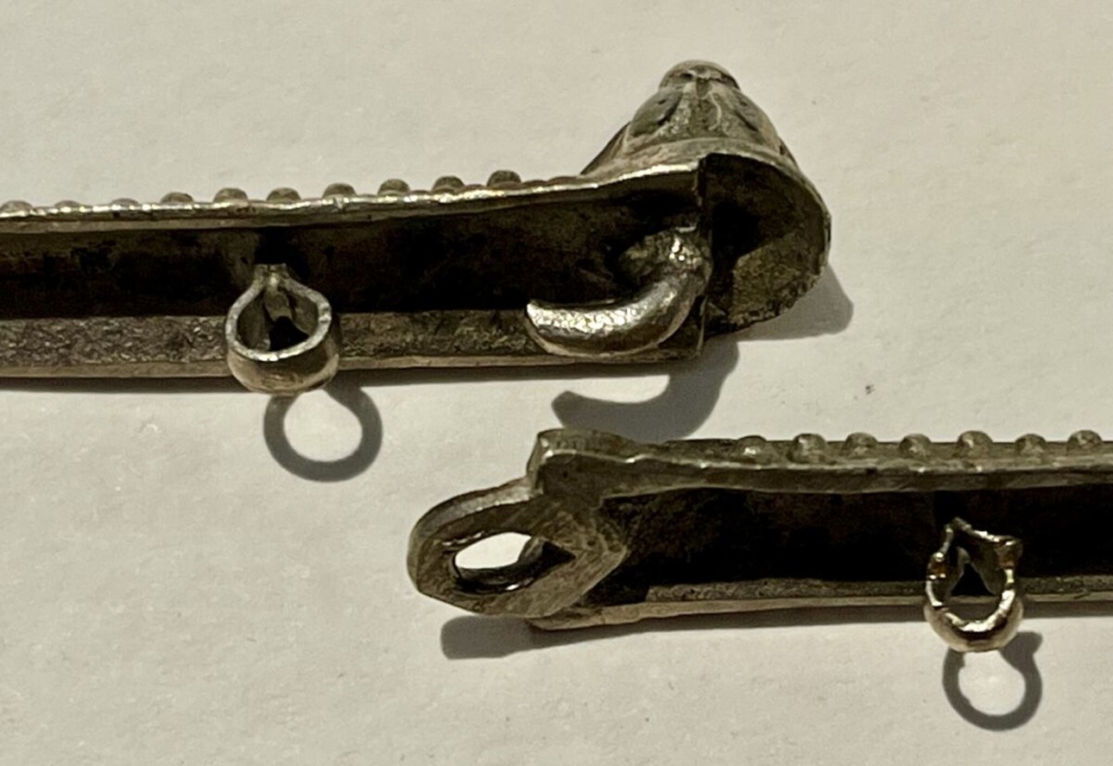 Niello-decorated bar clasps. Each long clasp is made as a paired closure: the two sides engage at the center by inserting the small ball-shaped section through the loop, then straightening the pieces so the bar aligns and holds securely. Their elongated form made them both practical fasteners and decorative accents across the garment or the belt.