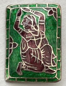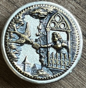This button is named “Love’s Messenger” in the Big Book of Buttons, which notes that the bird carrying the letter is a swallow. Swallows, for their monogamous nature, symbolize love and…